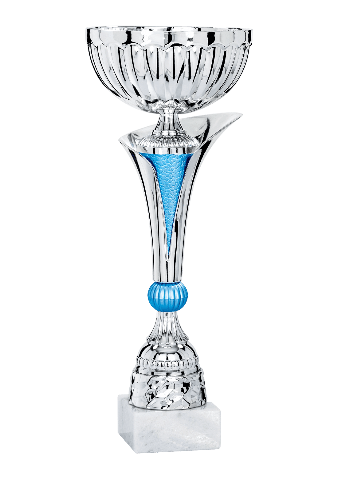 Ligne Economique. Coupe de 41 cm de hauteur, en ABS bicolore (argent & bleu), bol en métal couleur argent ( diamètre 16 cm) et socle en marbre gris/blanc (85x85x40 mm). Personnalisation possible avec plaquette gravée 70×30 mm, de couleur or ou argent.