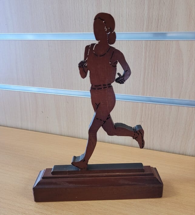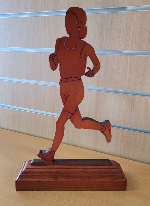 Trophée en bois, en découpe laser d’une épaisseur de 2 cm, et représentant la discipline de la Course Féminine Personnalisation possible avec plaquette gravée, de couleur or ou argent. Autres disciplines disponibles.